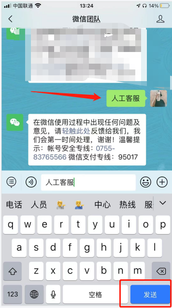 3. 进入到微信团队界面后,在下方输入框中输入人工客服,然后点击发送。