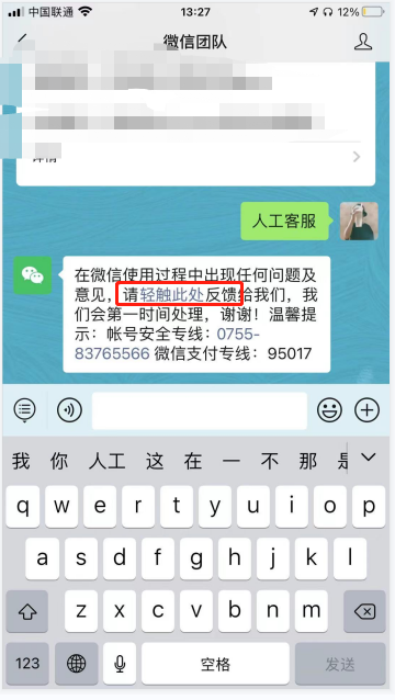 4. 这时微信团队会回复一条消息,点击轻触此处进入意见与反馈。