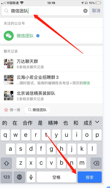 2. 在搜索框中输入微信团队并搜索点击进入。