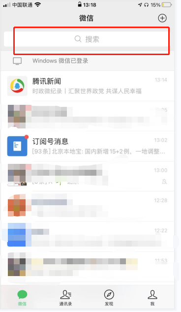 1. 打开微信,进入到主界面后,点击上方的搜索框。