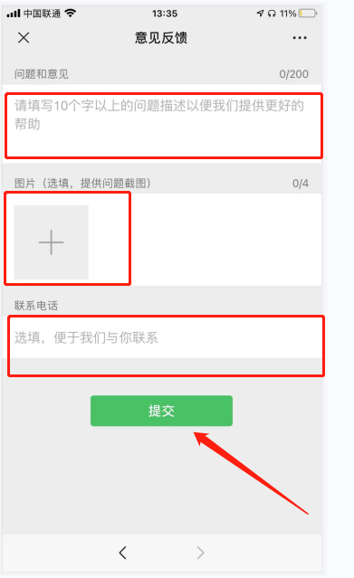 7. 然后就会进入到问题和意见的界面,在输入框中,输入群解封的理由,能够选填图片或截图等,完后填写联系电话,最后点击提交即可,等待客服处理的结果。