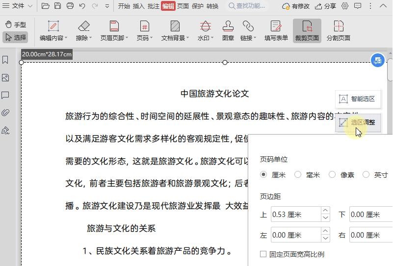 ▪点击“选区调整”可以设置页码单位、页边距,例如设置单位为“厘米”。