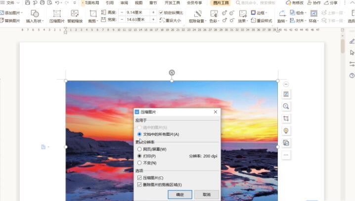 ▪第二步:在压缩图片对话框内勾选文档中的所有图片,对图片分辨率进行选择,勾选压缩图片确定即可。