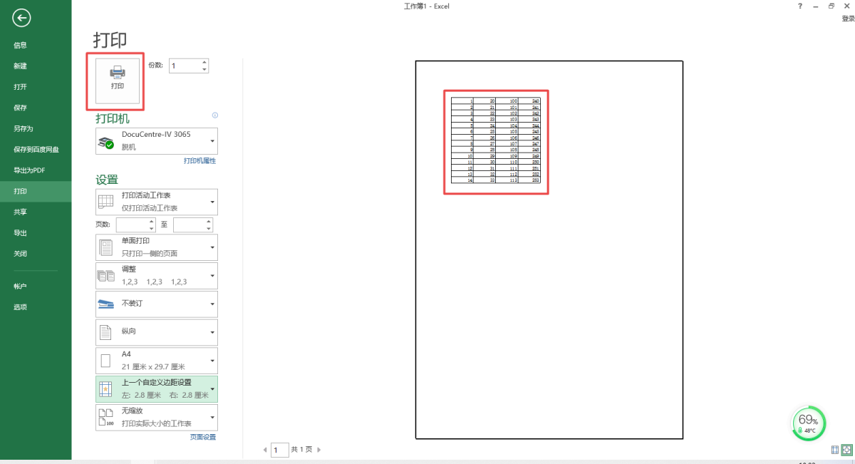 第六步,最后我们的表格处于想要的打印位置上后,直接点击【打印】按钮开始打印即可。