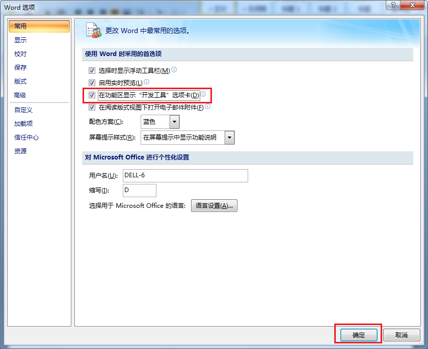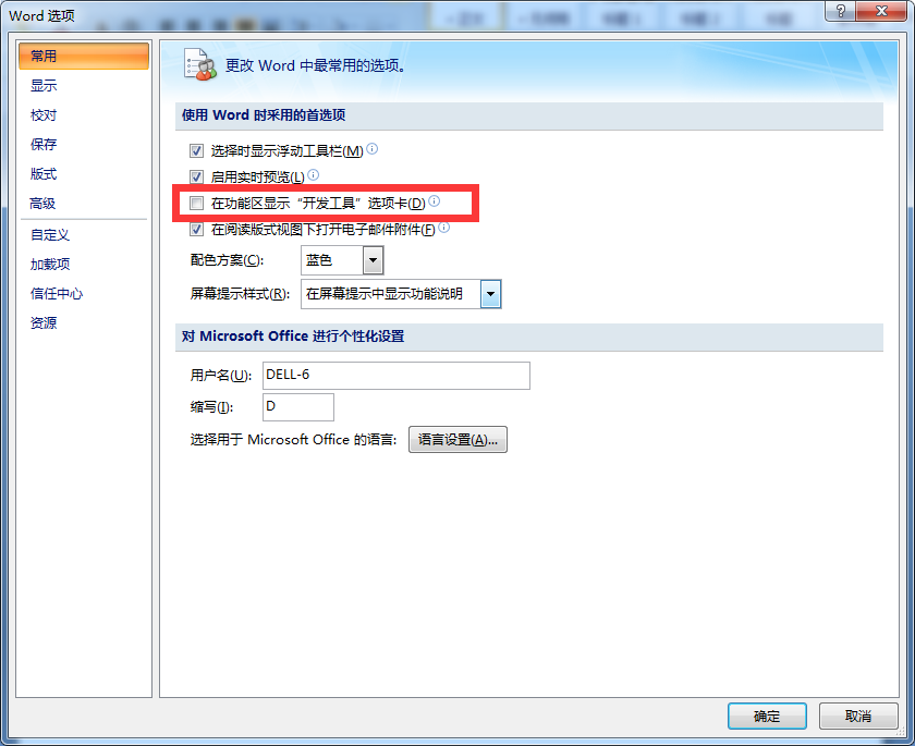 第二步,进入到Word选项设置界面后,我们在【常用】功能的右侧界面中,就可以在【使用Word时采用的首选项】一栏的下方,看到【在功能区显示“开发工具”选项卡】的选项,但是此选项是没有进行勾选的,怪不得工具栏上没有开发工具呢。