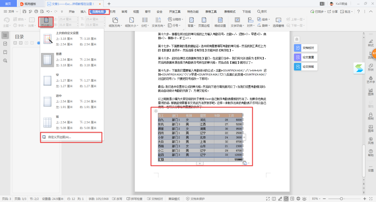 如果在Word的文章内容中,插入了表格,而表格又该如何横向显示呢?首先,选择所需要的改变显示方向的表格,然后找到工具栏上方的【页面布局】选项卡,然后选择【页边距】右侧的【▽】按钮,在弹出的下拉选项中选择【自定义页边距】选项。