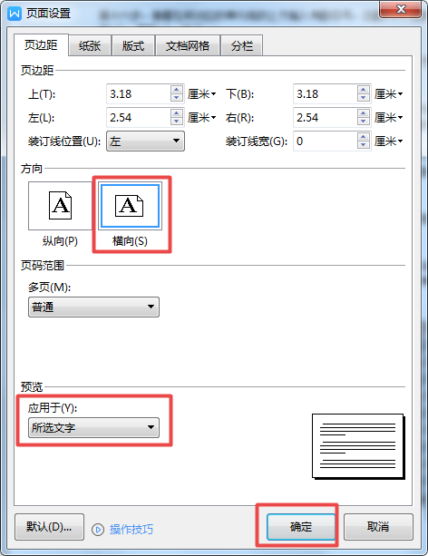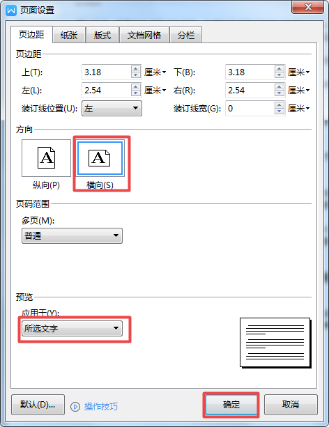 第二步,在弹出的【页面设置】窗口当中,将方向选择为【横向】,然后将应用于下方的选项选择为【所选文字】,最后点击【确定】按钮,就可以实现当前文字页面的横向页面的改变了。