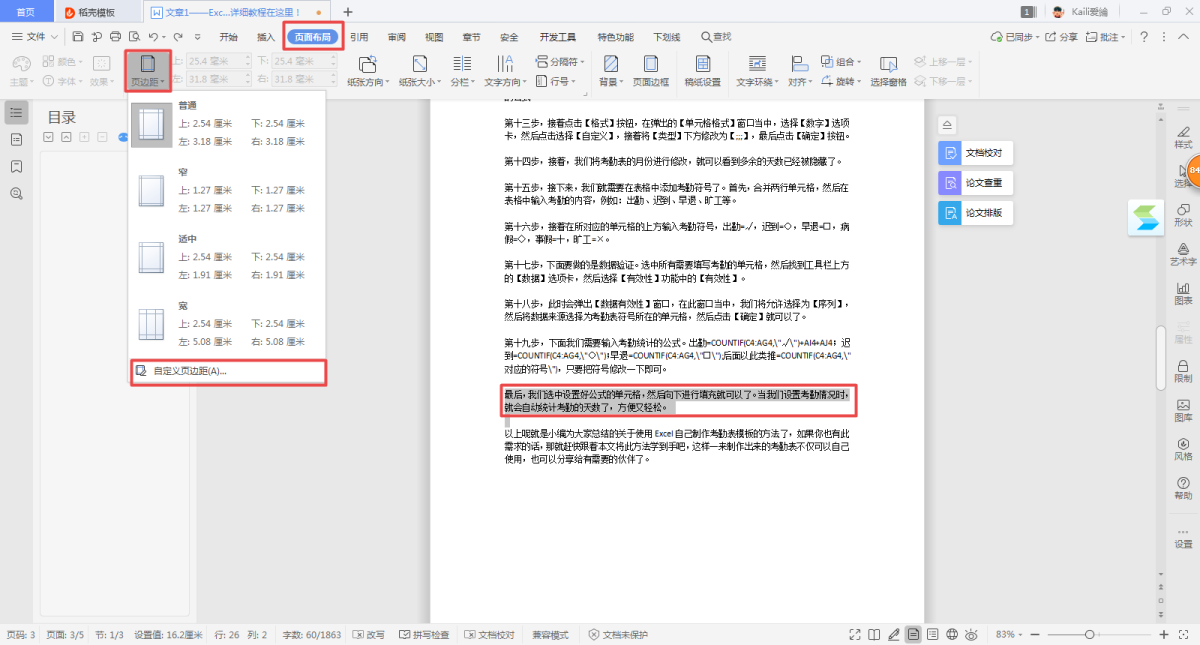 第一步,选择需要进行转向的文字,然后点击工具栏上方的【页面布局】选项卡,然后选择【页边距】右侧的【▽】按钮,在弹出的下拉选项中选择【自定义页边距】选项。