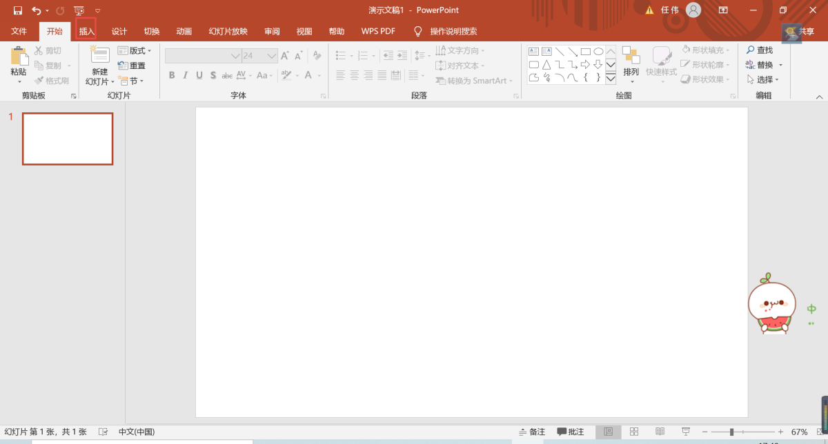 第二步,进入到新建的PPT界面中后,我们找到工具栏中的【插入】选项卡。