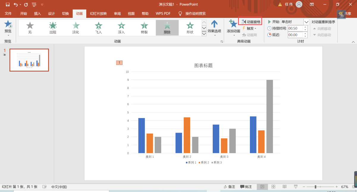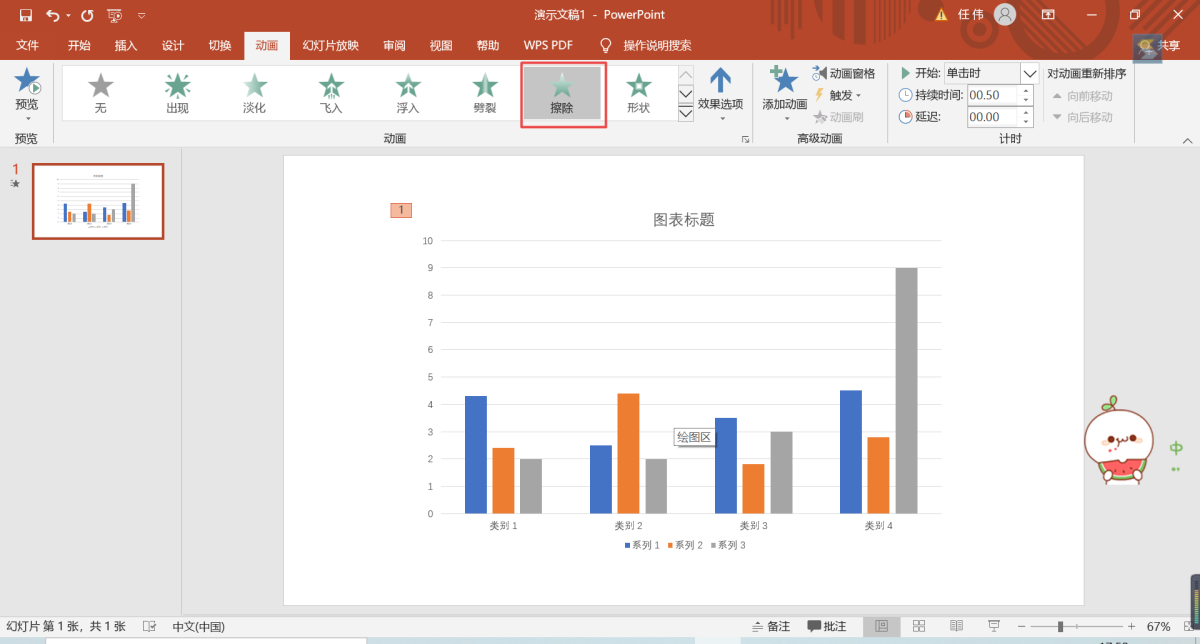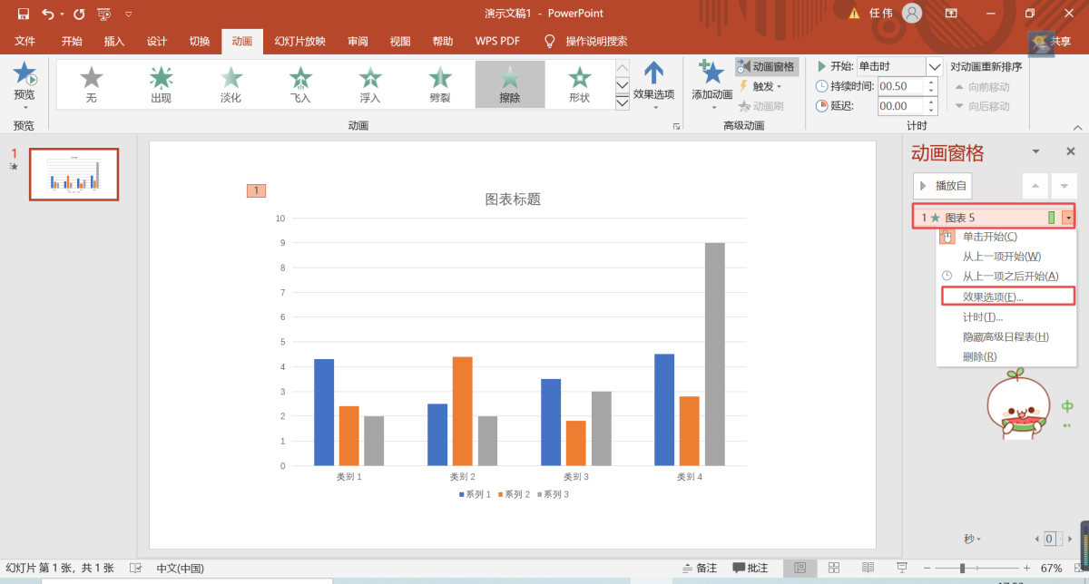 第六步,然后将图表的动画样式选择为【擦除】效果,或者是你所喜欢的效果。