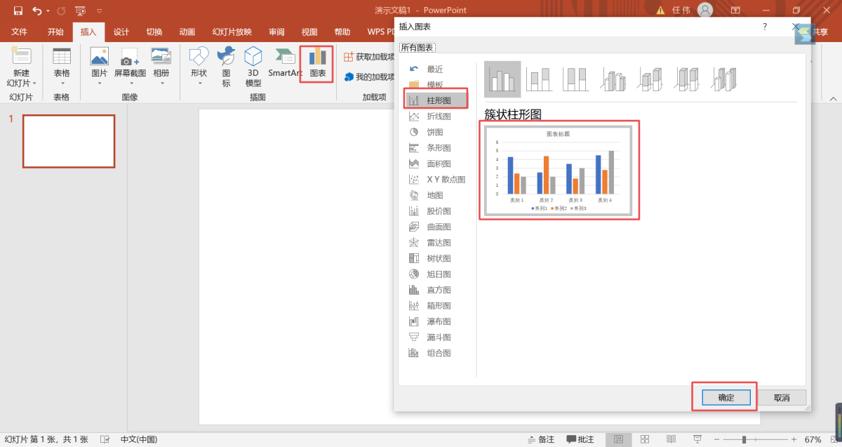 第三步,在插入选项卡中,找到【图表】功能并点击,然后在弹出的窗口中选择【柱形图】选项,,然后点击界面右下角的【确定】按钮。