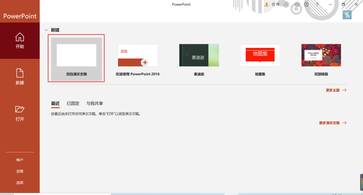 第一步,打开PowerPoint软件,然后新建一个PPT幻灯片文档。