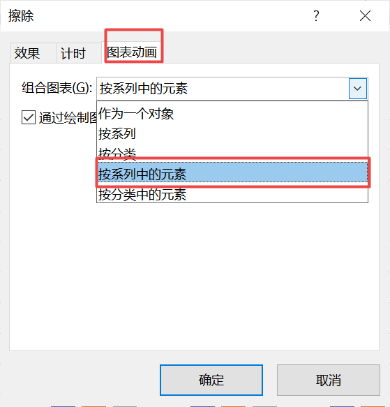 第九步,然后切换到【图表动画】选项中,将【组合图表】选择为【按系列中的元素】选项,最后点击【确定】按钮。