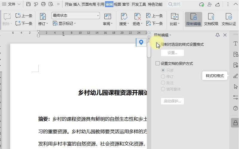 在右侧的“限制编辑”界面,我们可以根据所需勾选是否限制对选定的样式设置格式。