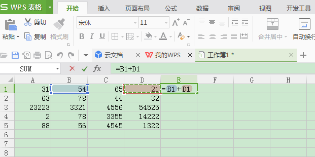 第二步、然后在E1单元格中输入计算公式:=B1+D1;