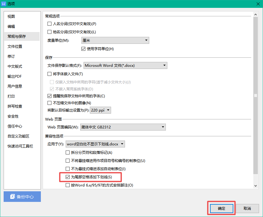 第四步,然后我们窗口界面的右侧,找到【兼容性选项】一栏下方的【为尾部空白添加下划线】选项,然后将其进行勾选,最后点击【确定】按钮。
