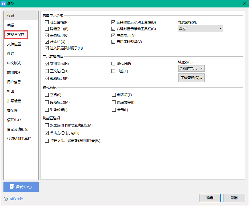 第三步,接着软件就会弹出【选项】窗口,在此界面的左侧,我们找到【常规与保存】选项,并点击进入。
