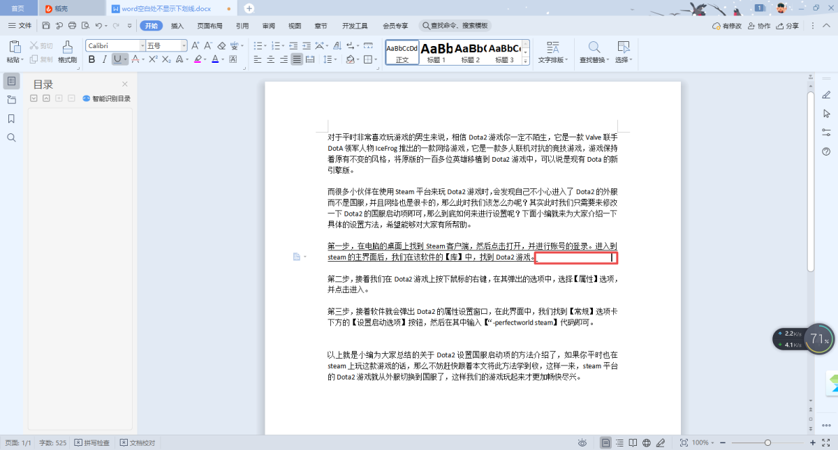 第五步,最后回到word文档界面后,我们就会发现,文字段落的空白处也显示了下划线了。