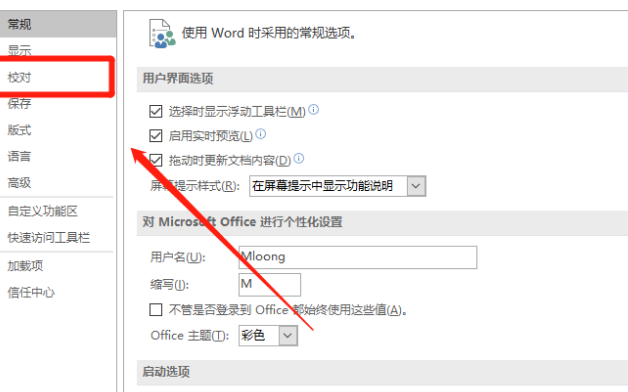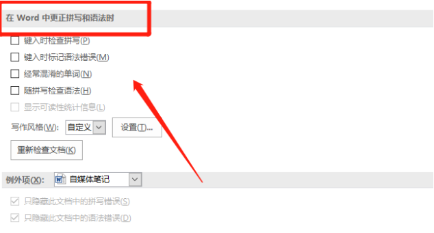 四、在校对选项中将“在word中更正拼写和语法时”一栏中的选项对勾全部取消。
