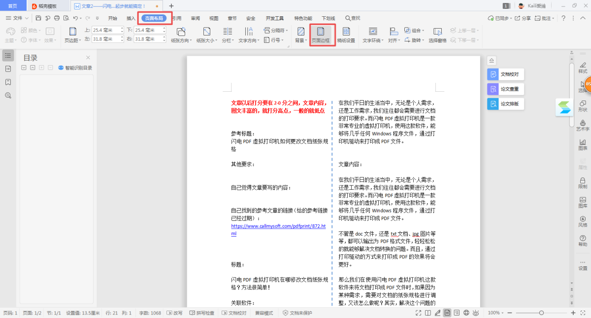 第一步,在工具栏上找到【页面布局】选项卡,然后找到【页面边框】功能,并点击打开。