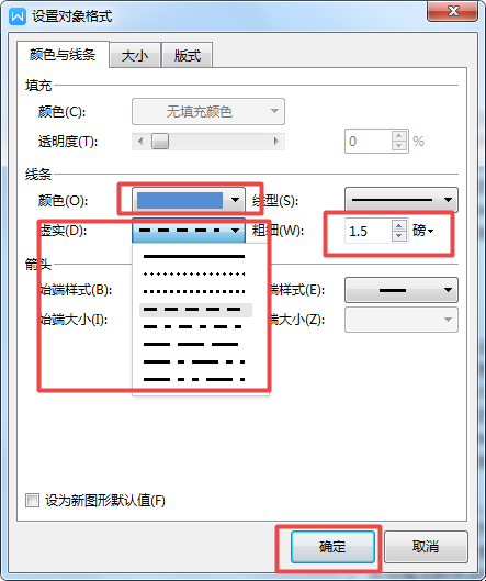 第五步,接着就会弹出【设置对象格式】窗口,在窗口当中找到线条一栏,然后点击【虚实】右侧的下拉选项,然后将其选择为虚线,最后点击窗口下方的【确定】按钮就可以了。你还可以设置线条的颜色以及粗细。