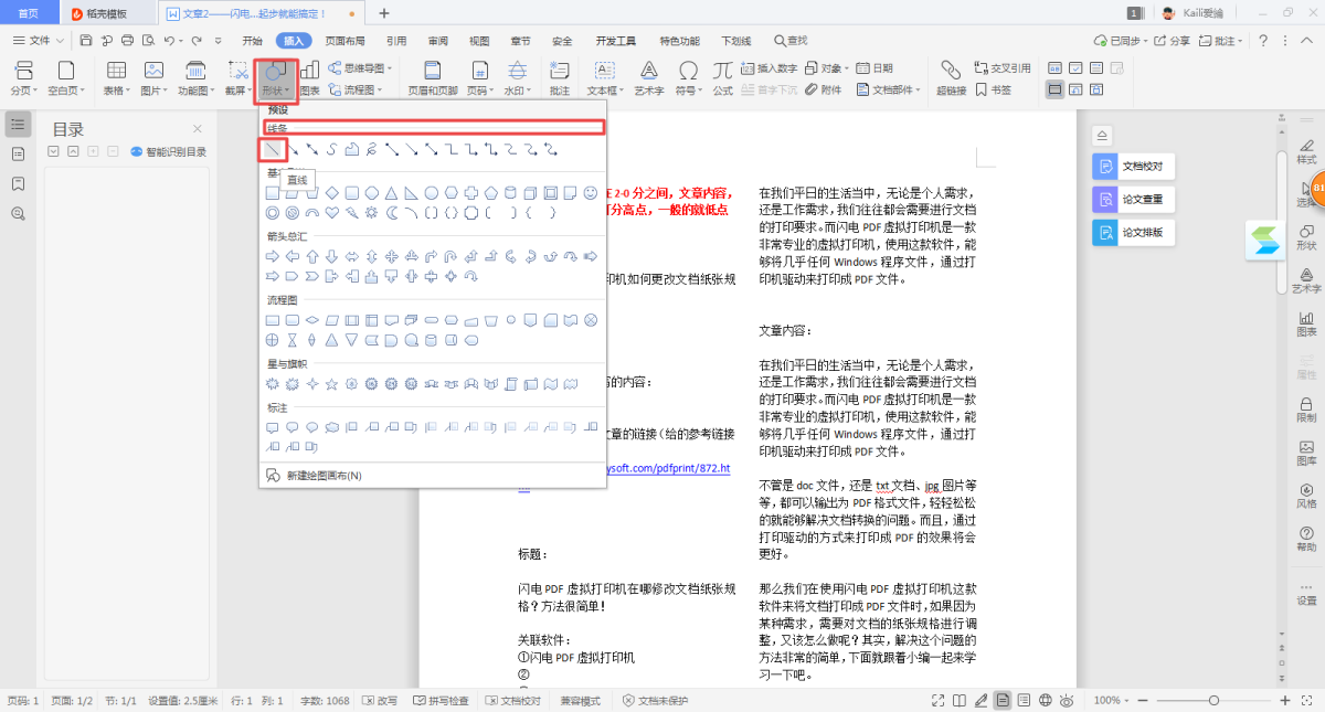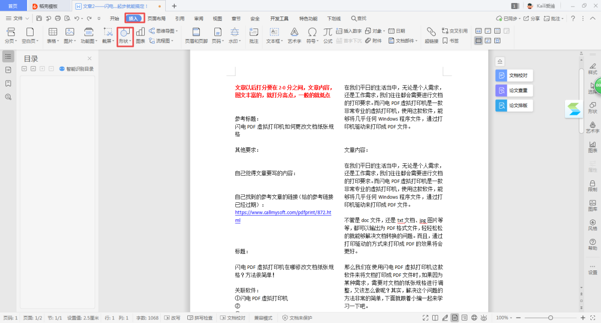 第一步,用WPS打开已经分栏的文档,然后在工具栏的上方找到【插入】选项卡,再找到【形状】功能。