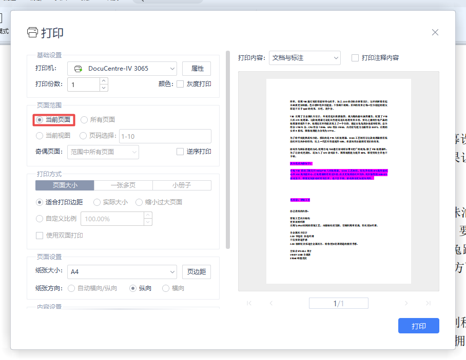 第三步,接着软件就会弹出【打印】设置窗口,在此界面的【页面范围】处,我们就可以来设置我们所需要打印的指定页面了。如果想要只打印当前选择的PDF页面的话,就选择【当前页面】选项。
