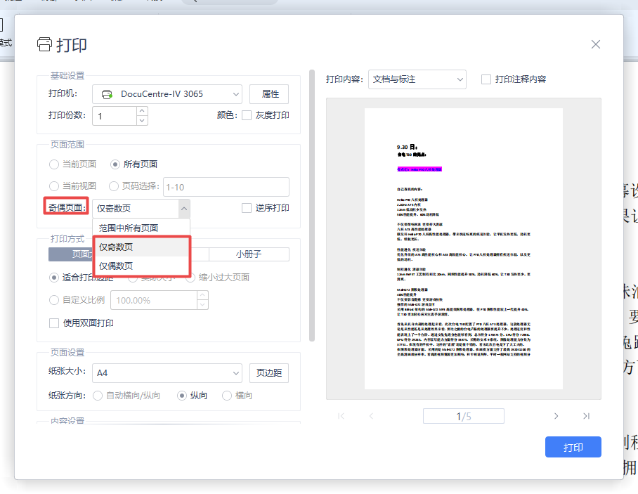 第六步,如果想要打印所设置的范围中的奇数页或者是偶数页的话,那么我们就在【奇偶页面】处进行选择,然后选择【奇数页】或【偶数页】,最后进行打印就可以了。