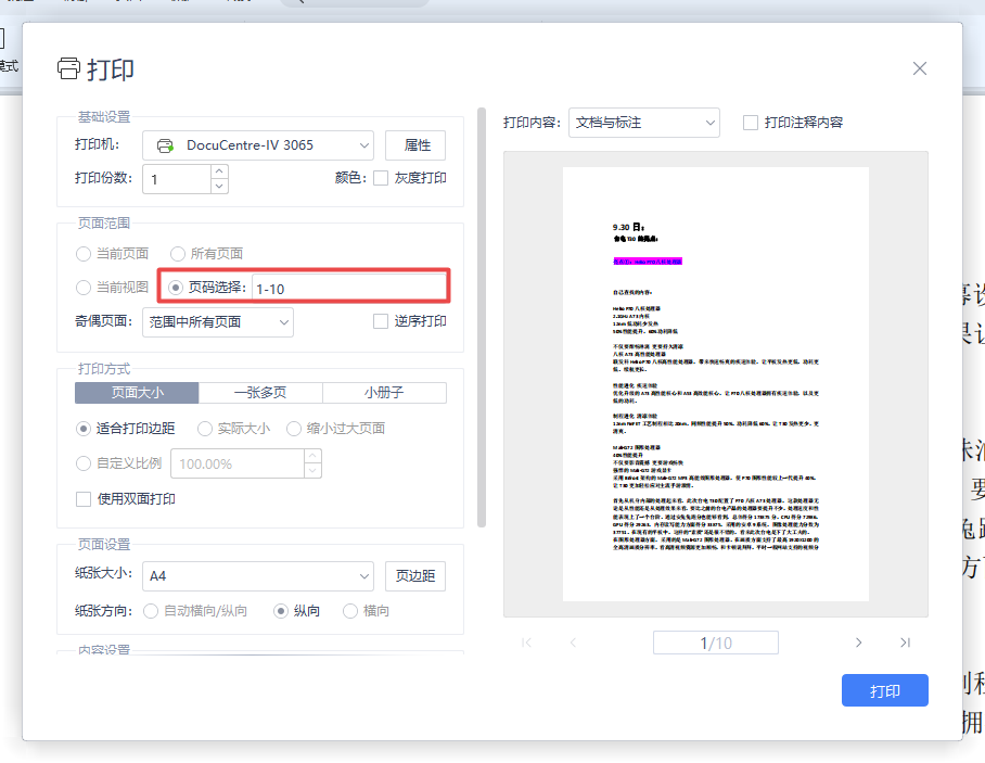 第五步,如果想要打印指定页码区域的话,我们就选择【页码选择】选项,然后在其后面输入要打印的页码区域,就可以指定打印页码区域的文件内容了。