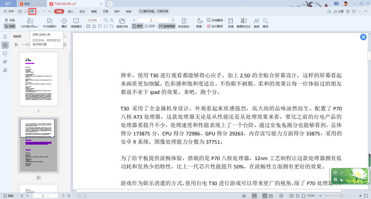 第二步,文档打开好以后,我们找到软件界面顶部的【打印】图标,然后点击进入。
