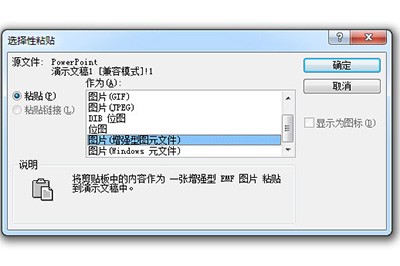 首先我们选择饼图,使用款借鉴CTRL+X将其剪切,然后点击左上角粘贴-选择性粘贴,选择图片(增强型图元文件),点击确定。