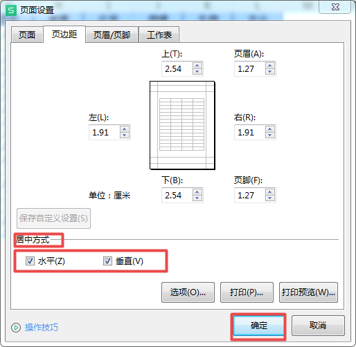 第四步,然后软件就会弹出【页面设置】的窗口了,在此界面的下方,我们找到【居中方式】一栏,然后勾选其下方的【水平】和【垂直】两个选项,然后点击【确定】按钮。