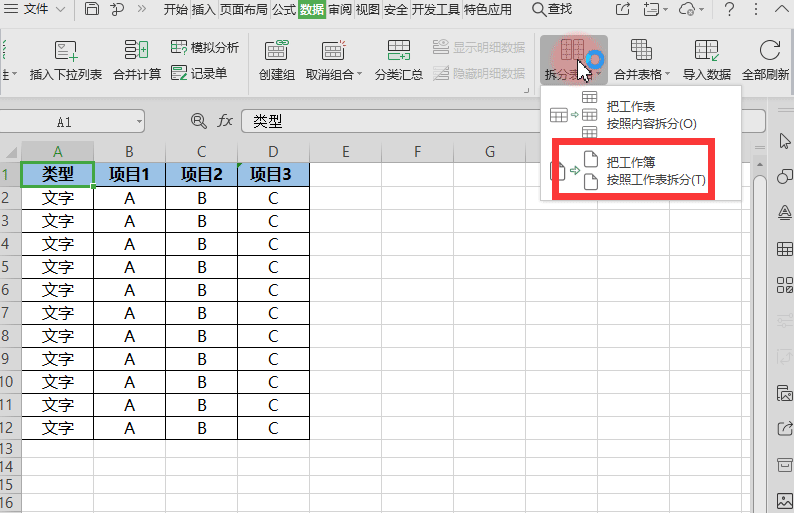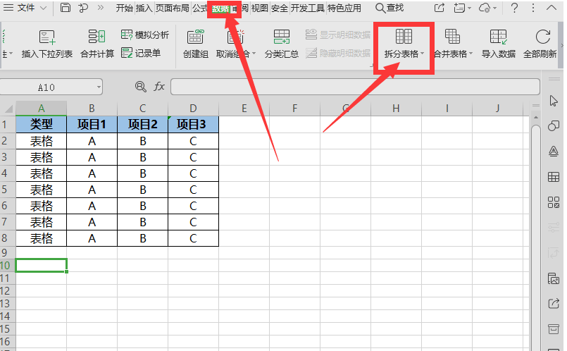 第一步,在我市中打开表格,点击【数据】下面的【拆分表格】。