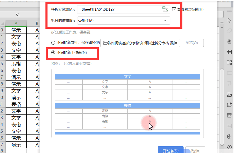 第二步,选择【按内容拆分】,然后在弹窗中选择【拆分区域】和【拆分依据】,直接拖动选中表格中内容即可,并且要勾选【不同的新工作表】选项,点击【开始拆分】即可。