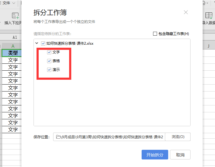 第二步,选择需要拆分出来的工作表的名称,点击【开始拆分】即可。