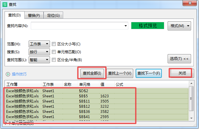第五步,接着点击【查找全部】按钮,这时表格中的所有绿色的单元格就被全部筛选出来了,此时我们按下键盘上的【Ctrl+A】来全选,然后点击【关闭】按钮。