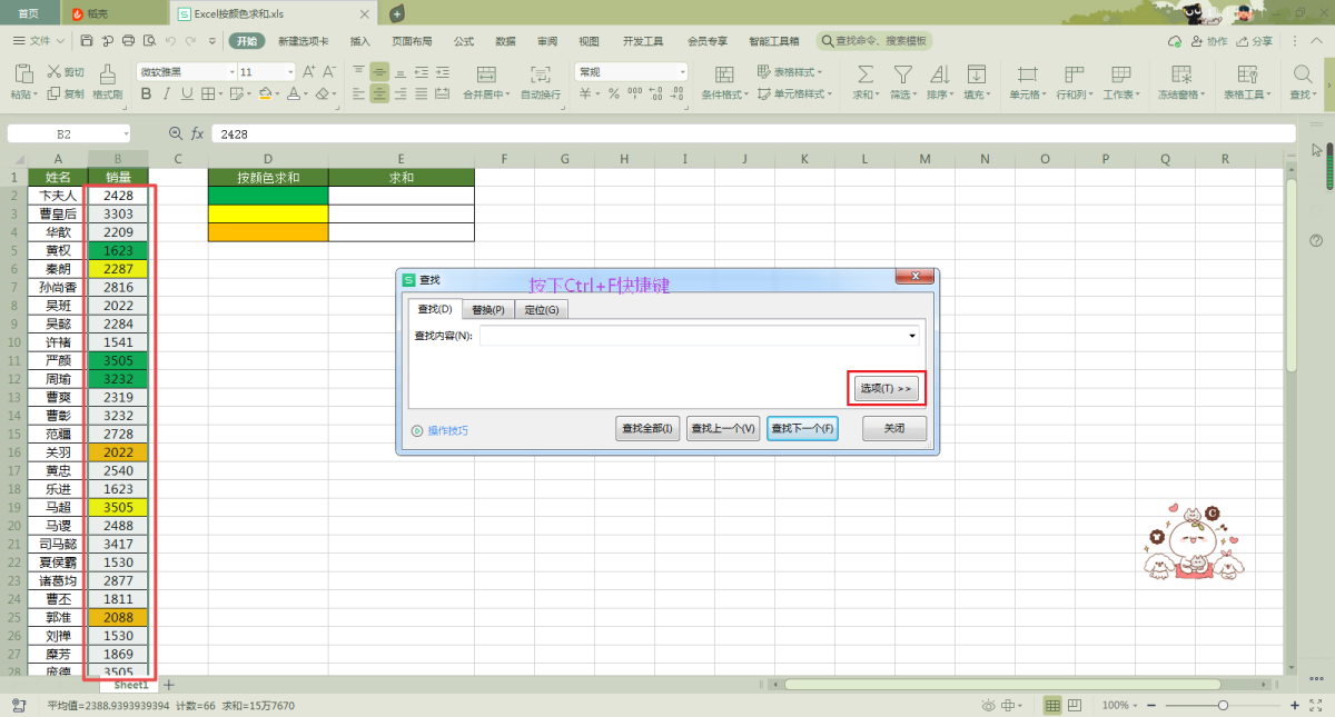 第三步,接着我们选中【B2:B67】的数据区域,然后按下键盘上的【Ctrl+F】快捷键,来打开查找对话框,接着点击对话框中的【选项】按钮。
