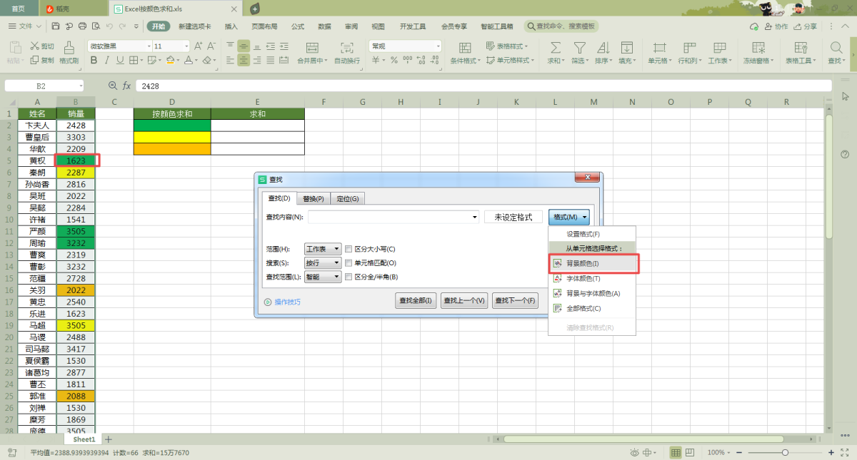第四步,然后在窗口中点击【格式】按钮,然后在其弹的选项中选择【背景颜色】选项,然后在表格中选中绿色的单元格。