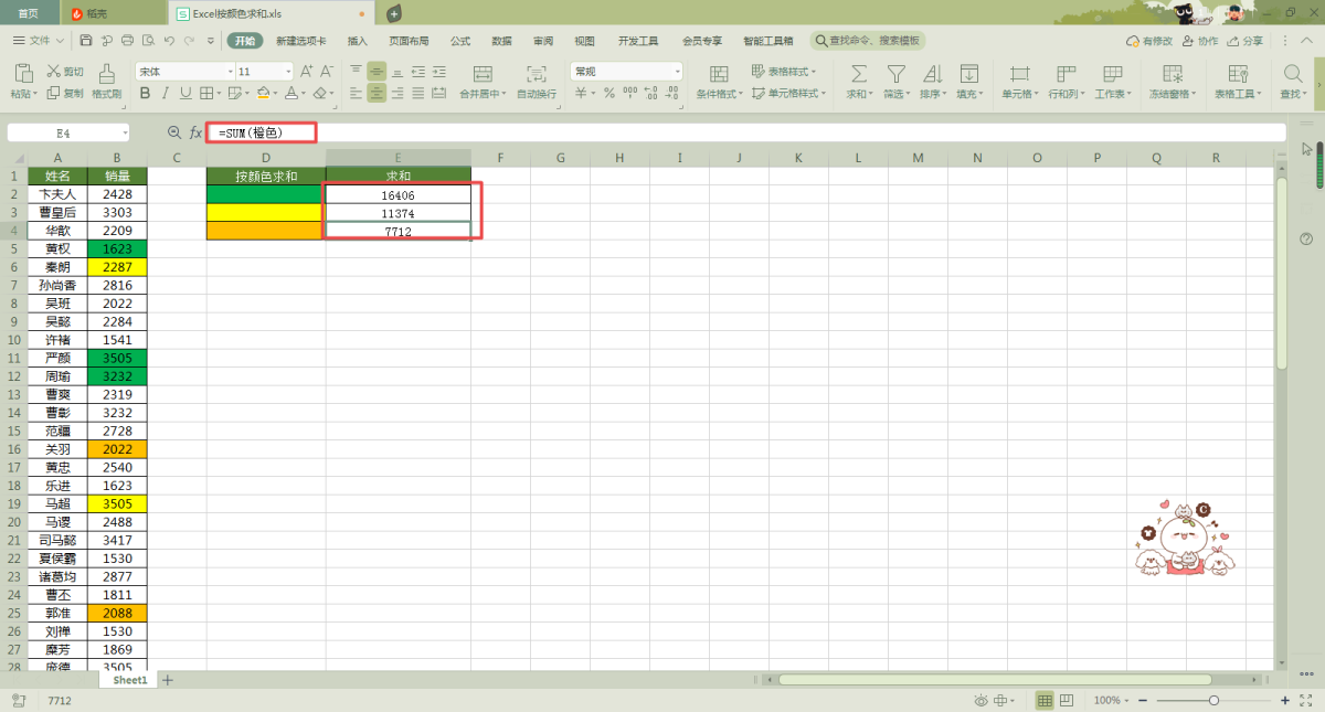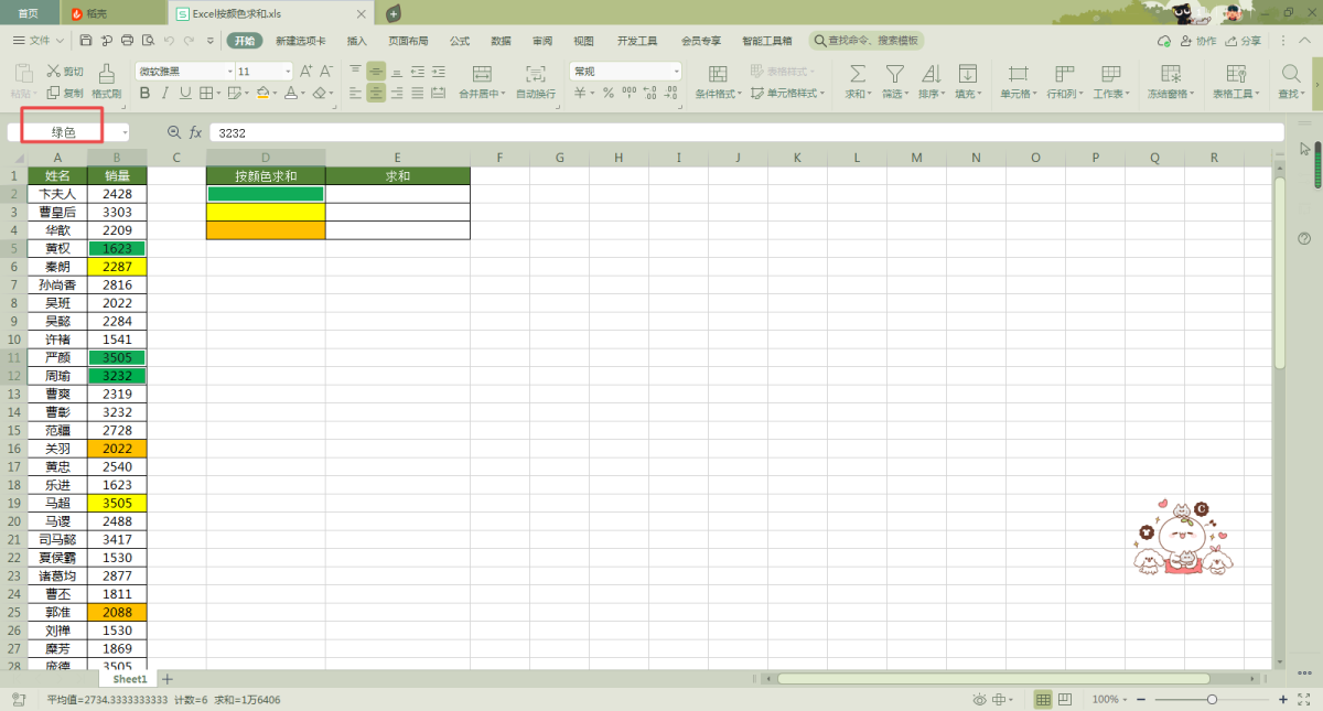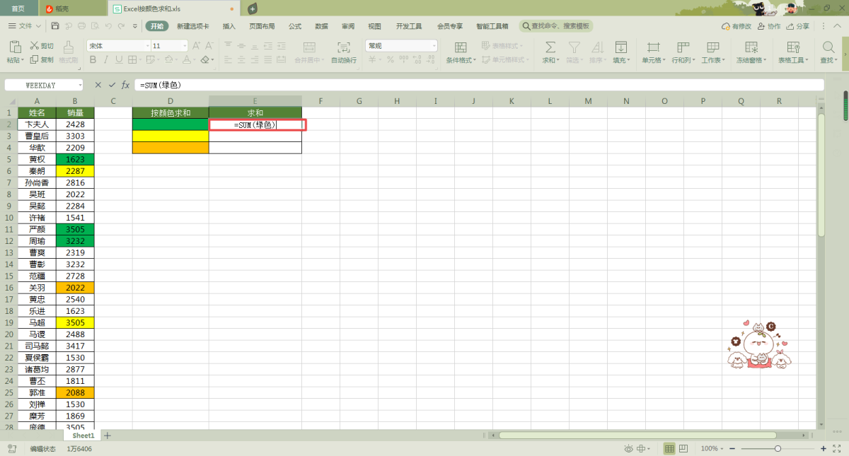第七步,最后我们在【E2】、【E3】和【E4】单元格中,分别输入【=SUM(绿色)】、【=SUM(黄色)】和【=SUM(橙色)】的公式,就可以完成对不同颜色的单元格进行求和了。