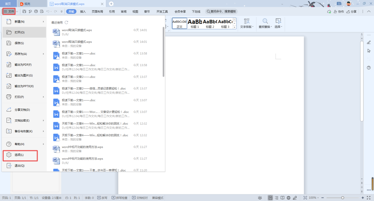 第四步,接着我们就成功的打开文档了,而为了防止文档下次以只读的模式打开,此时我们需要将文档的编辑密码进行取消。在软件工具栏上左上角,找到【文件】选项,然后点击它,接着我们选择其下方的【选项】。