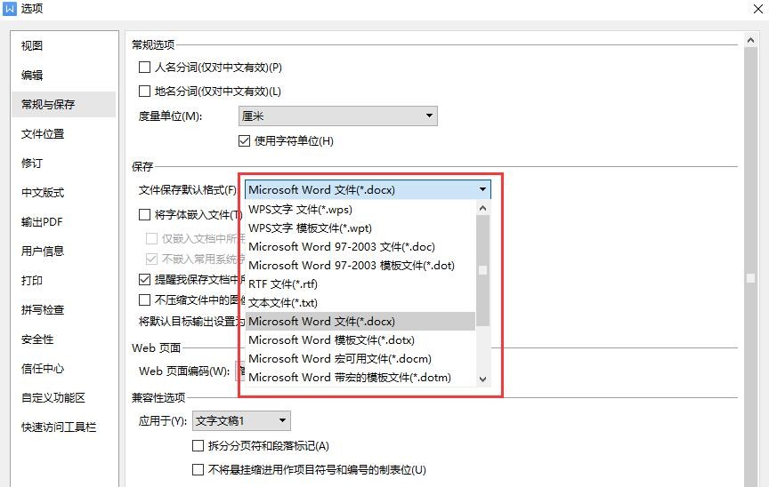 ▪以此文档为例,若我们需要经常性的,将文档保存为网页“html”格式,点击左上角「文件」-「选项」- 「常规与保存」,在「文件保存默认格式」处可以修改保存时的文档格式。