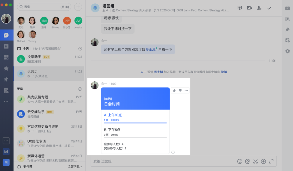 如果是一些简单直接的问题,比如确定例会时间、选择团建奖品等,直接在群聊中发起投票,成员即可一键快速表态。投票之后,团队成员可以直观地看到各个选项的票数,以及已投未投的人数。