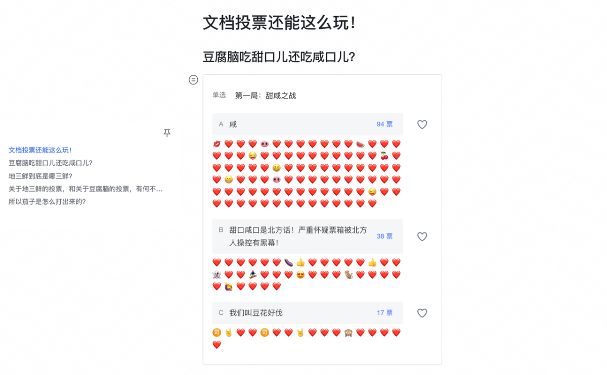 还可以用文档投票做一些趣味的小互动,比如选择食物口味,建议食堂加菜等等,成员可以用自己喜欢的emoji进行投票,花式表达意见。