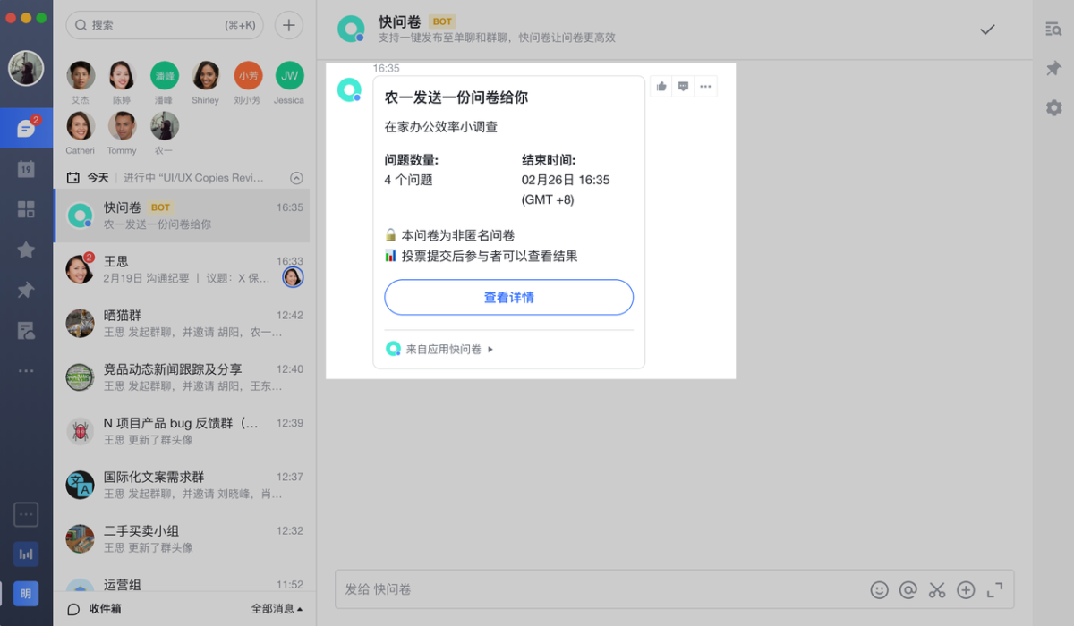 问卷内容编辑完成后,一键分享到私聊或群聊中,团队成员直接点击即可开始回答问题。问卷的回答结果也会在应用中清晰展示,方便统计和分析信息。
