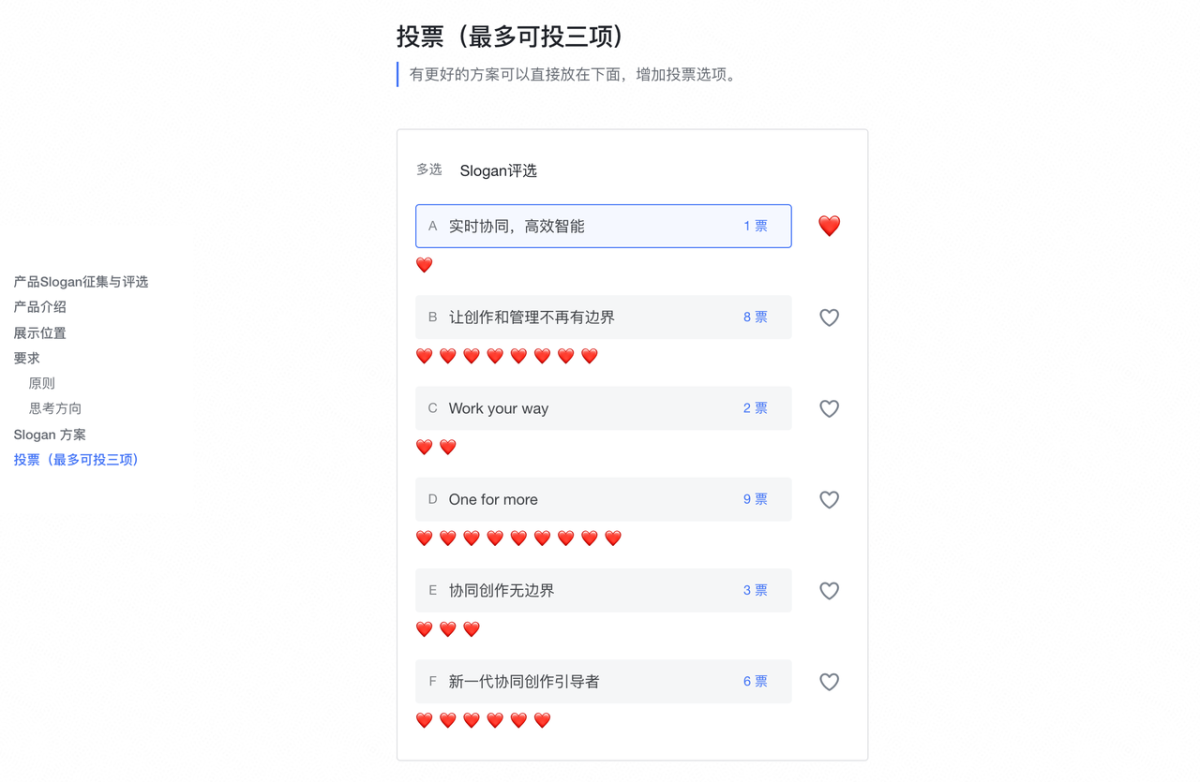 把与问题或事项相关的上下文写在文档中,并在文档中直接插入投票,让成员依据这些信息来进行选择。如果成员有新的提议,也可以直接在文档中评论或增加选项。