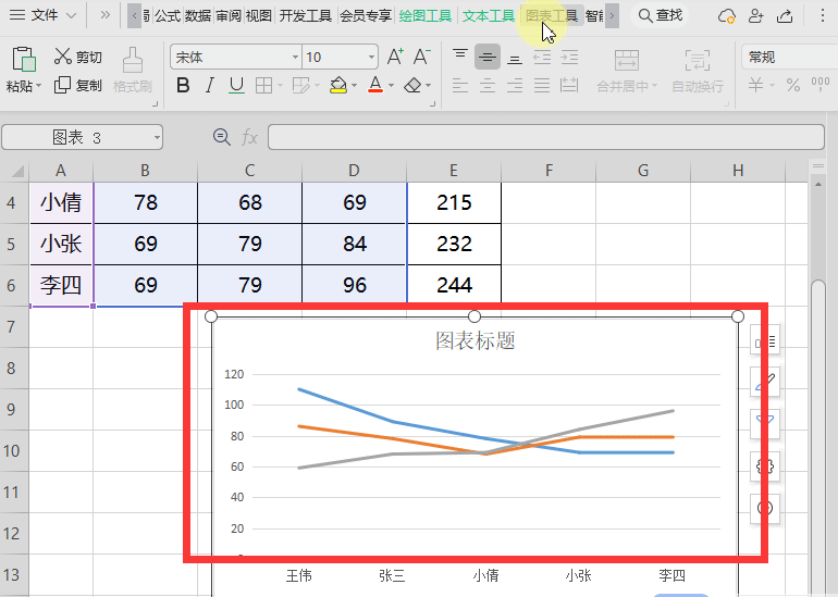 第一步,在WPS表格中,将需要进行更改图表类型的表格打开,并鼠标单击选中图表。