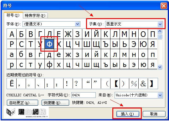 子集切到 西里尔文 将看到Ф符号,选择后插入。