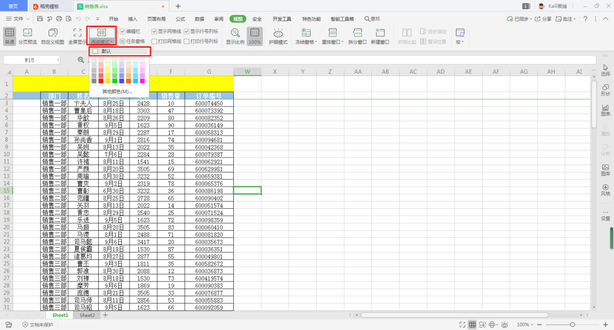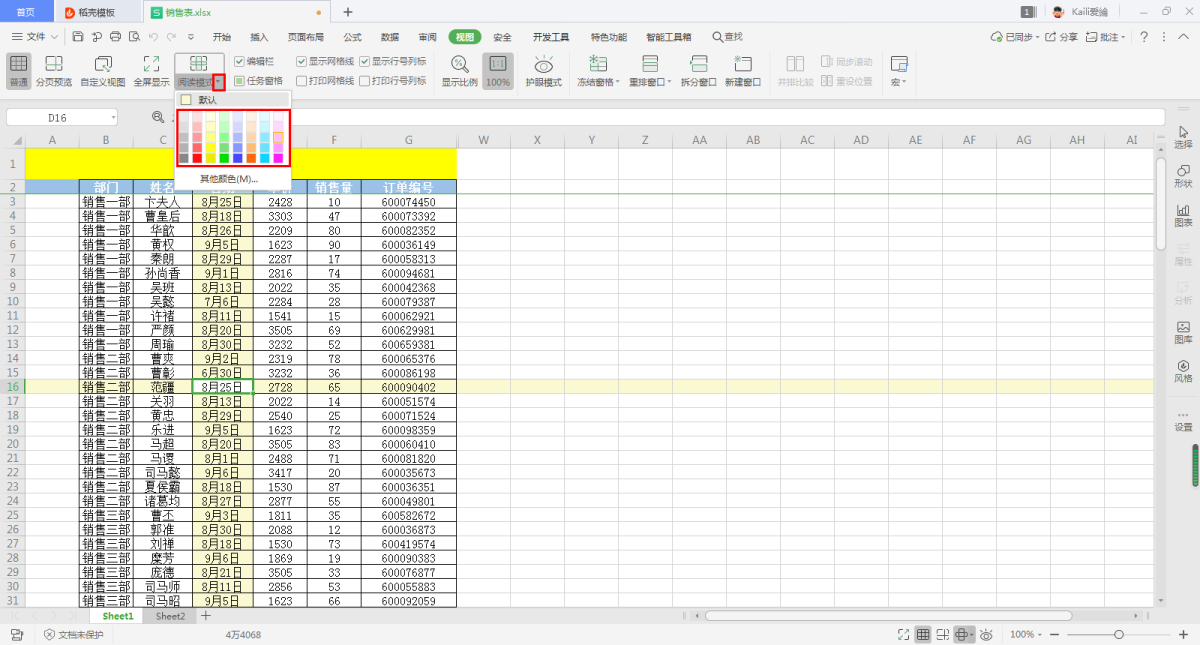 第五步,当然了,我们还可以对阅读模式的表格标注的颜色进行修改,点击【阅读模式】右侧的下拉按钮,然后在其下方的颜色中,选择一个自己所喜欢的、习惯的颜色,然后点击进行选择。