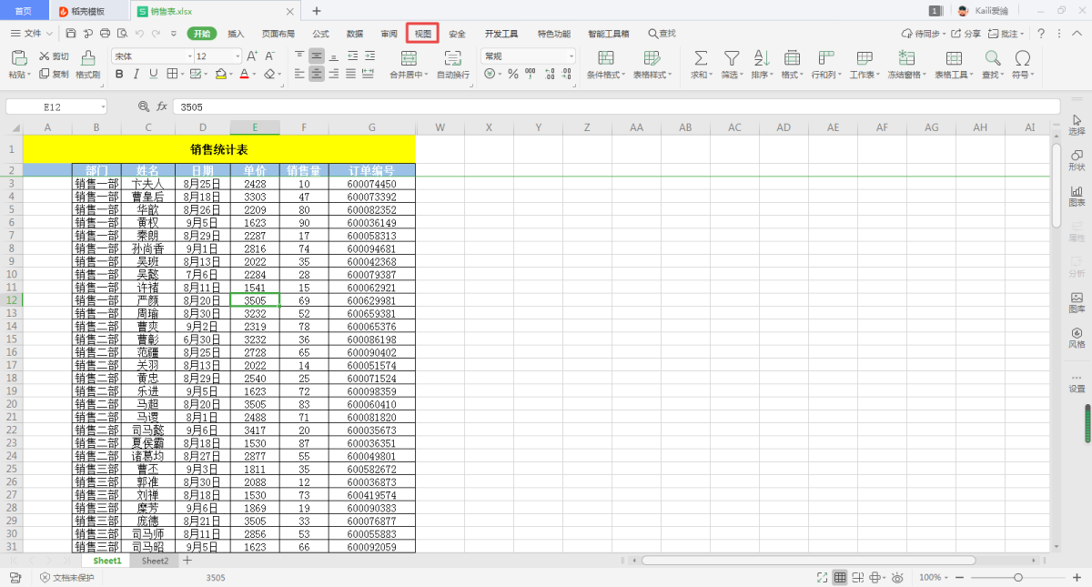 第二步,表格打开好以后,我们找到软件界面工具栏上方的【视图】选项卡,然后点击进入。