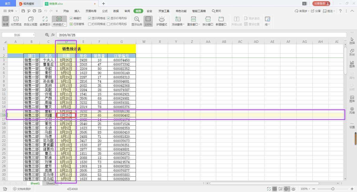 第四步,此时我们在点击Excel表格当中的某一行数据时,就会发现,此时所点击的单元格所在的行和列就都会有标注了,这样不管我们是看什么数据,都不会再看错了。
